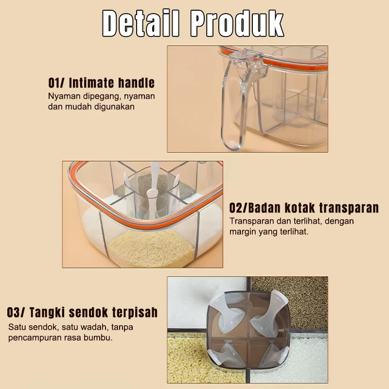 1 wadah bisa isi 4 jenis bumbu — gak perlu banyak toples lagi.